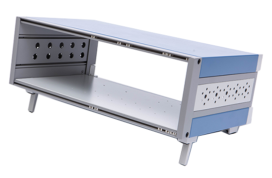 A型機箱由上蓋板,下蓋板,前面板,后面板,側板,底腳,把手,前后梁等配件組裝而成,為臺式機箱。標配型機箱表面經噴塑處理,噴塑的塑粉顏色可以按照客戶要求選定,白、灰色為行業首選的經典顏色。